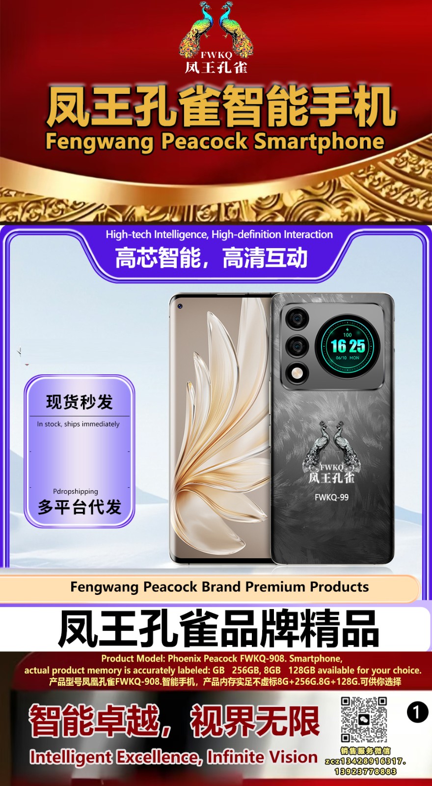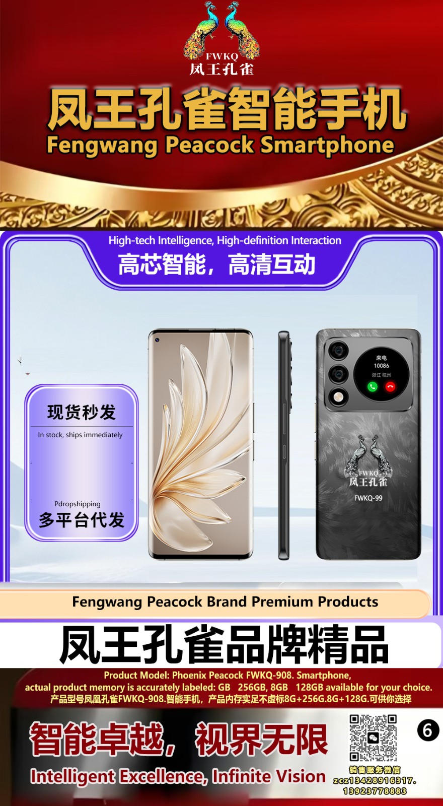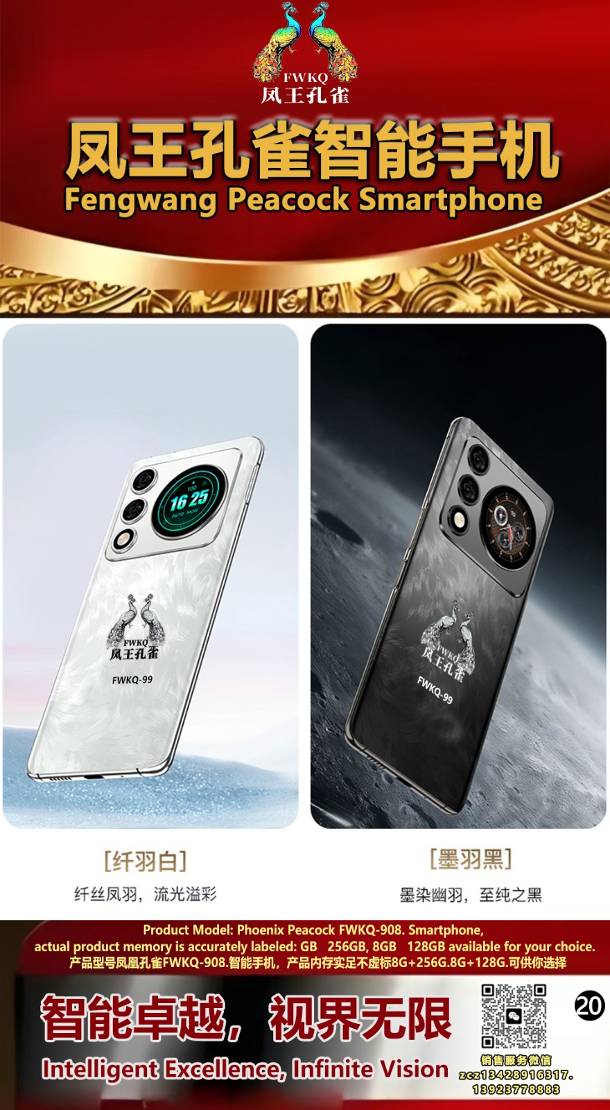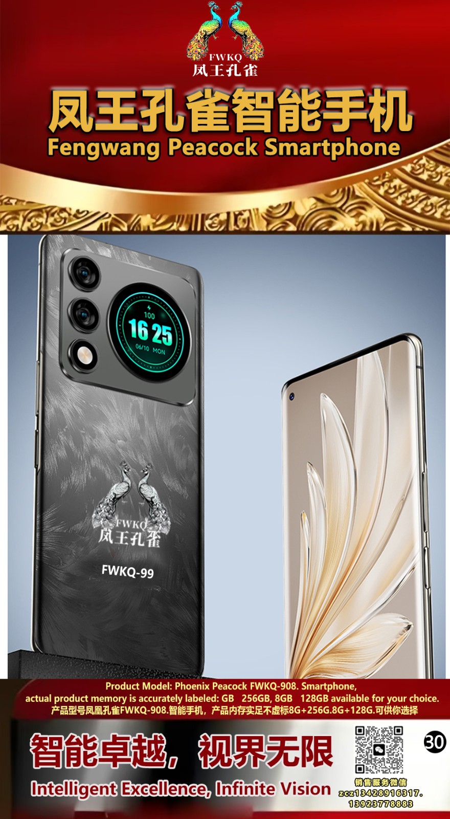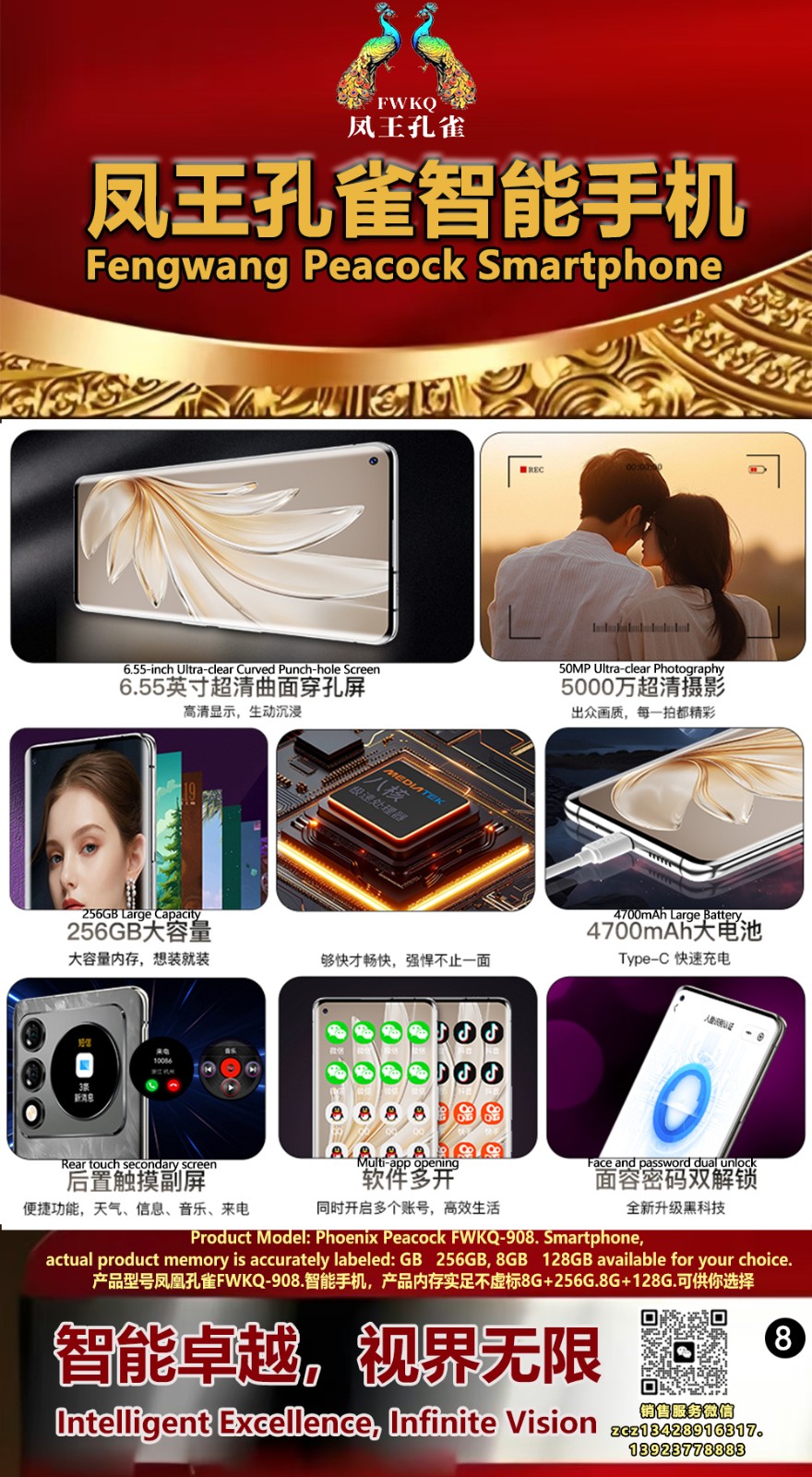 FWKQ凤王孔雀智能手机6.55英寸 -产品编号:L66, FWKQ-99 实足8G+128G售价1180元。8G+256G 售价.1680 像素5000万 深圳包邮 产品链接 视频链接