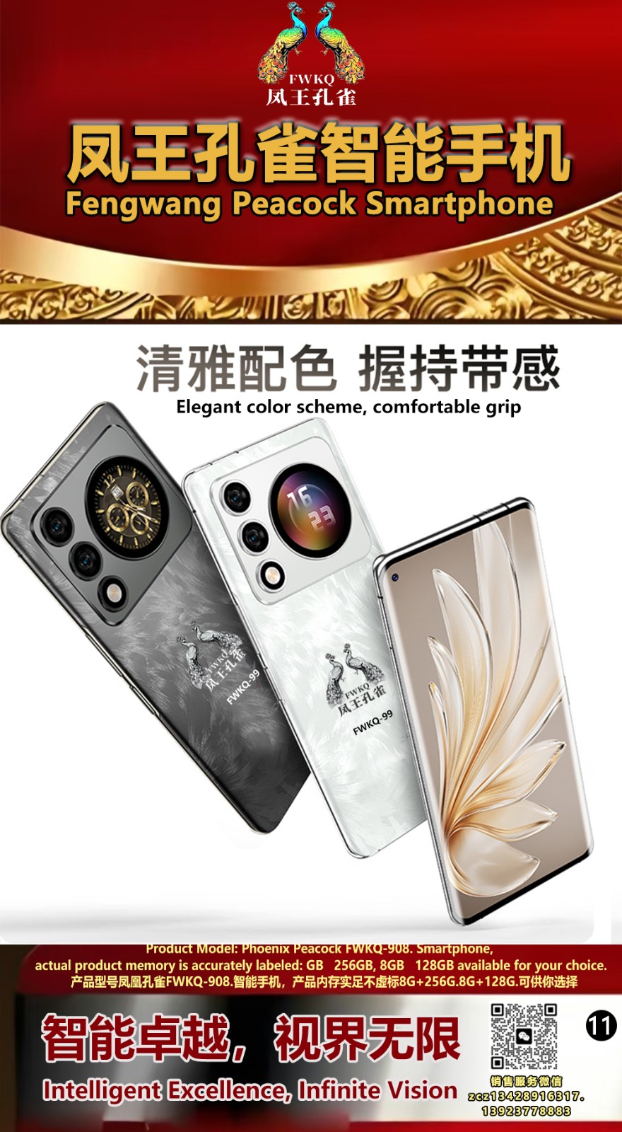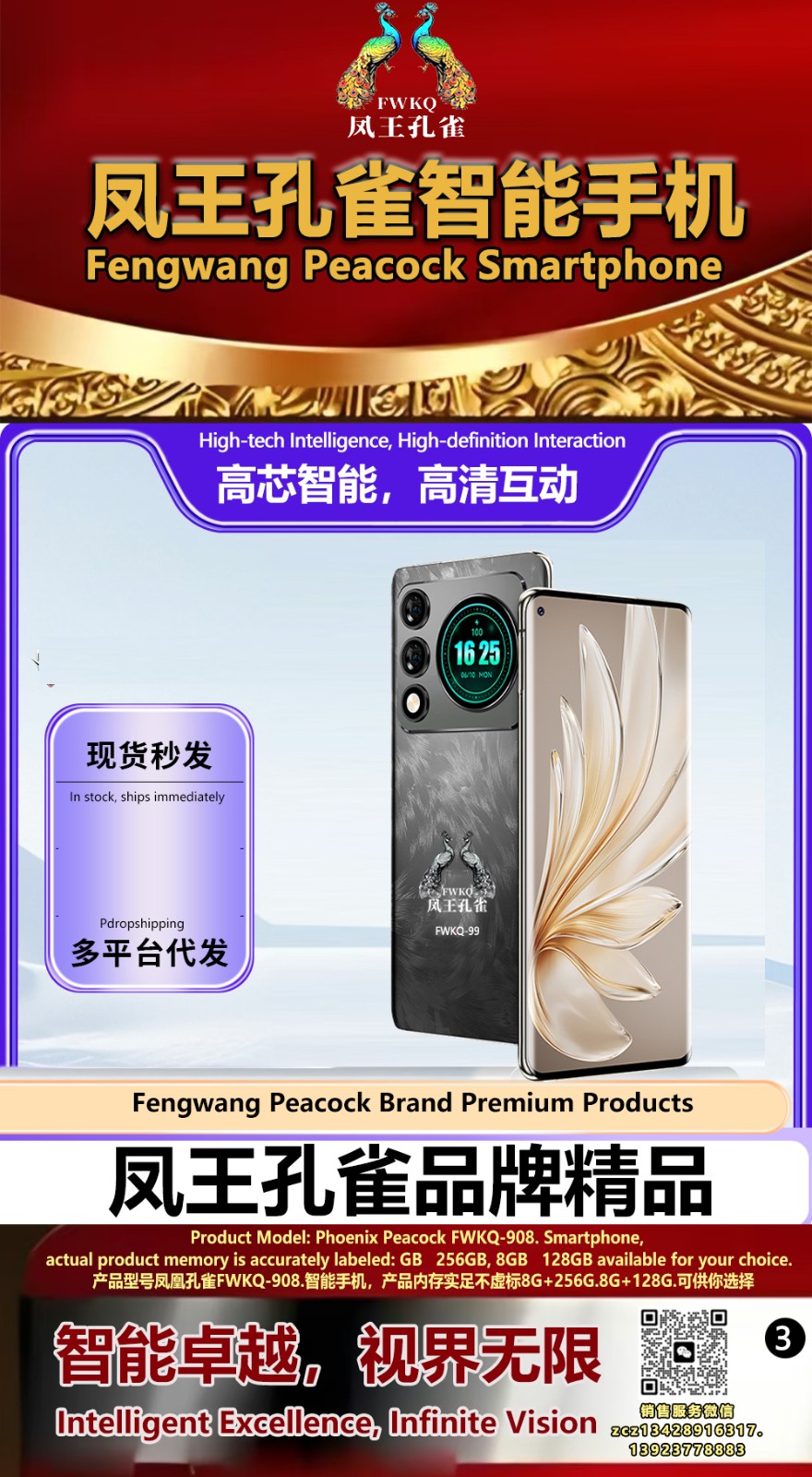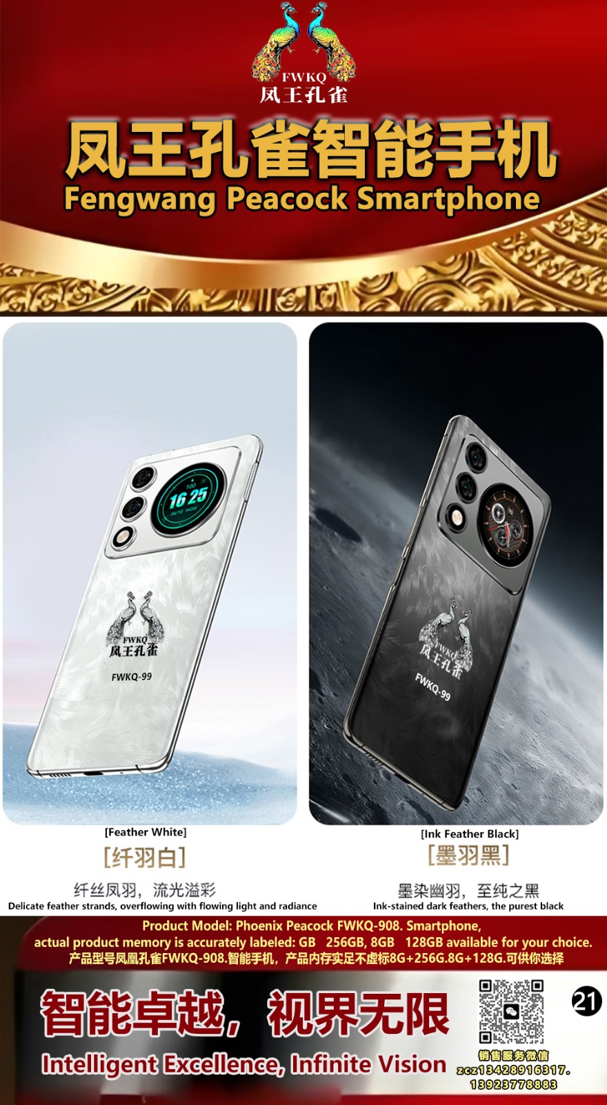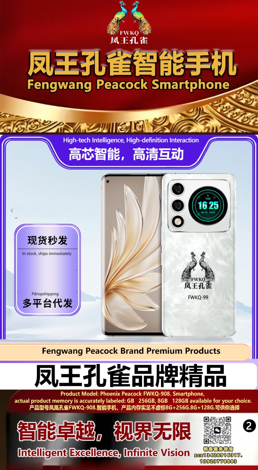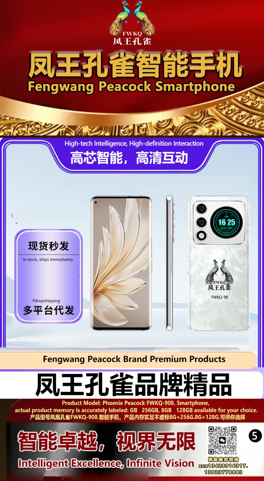FWKQ凤王孔雀智能手机6.55英寸 -产品编号:L66, FWKQ-99 实足8G+128G售价1180元。8G+256G 售价.1680 像素5000万 深圳包邮 产品链接 视频链接