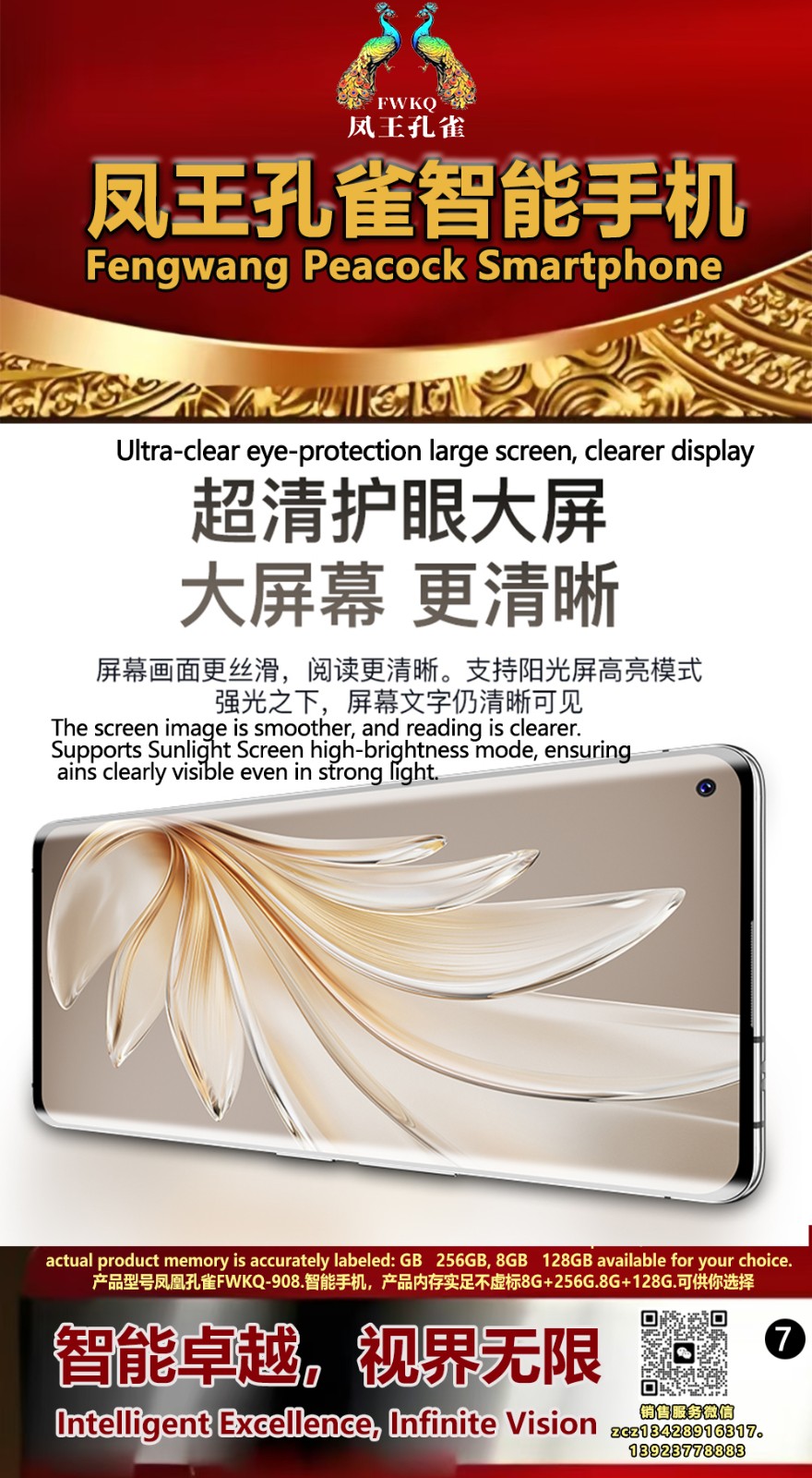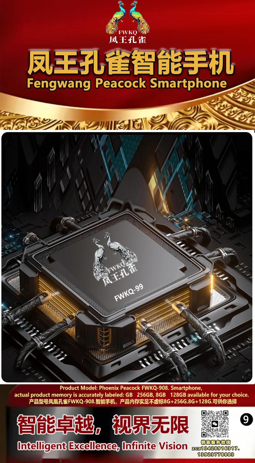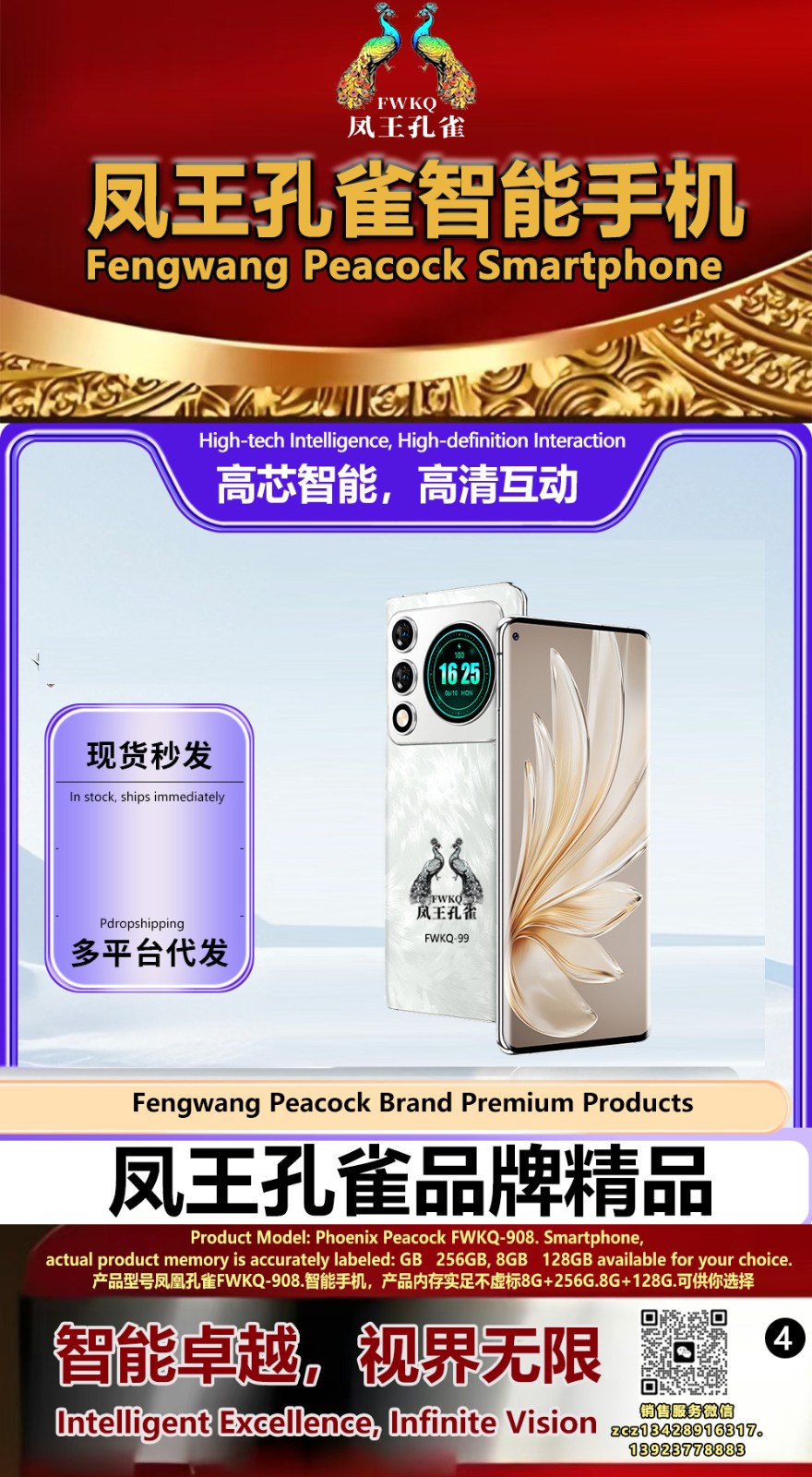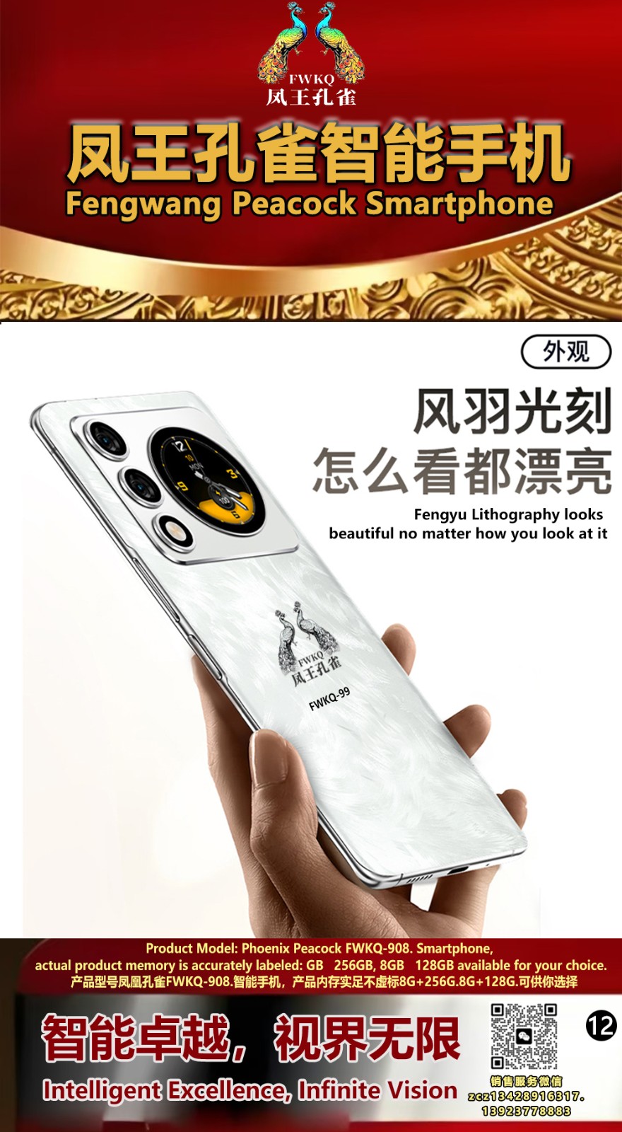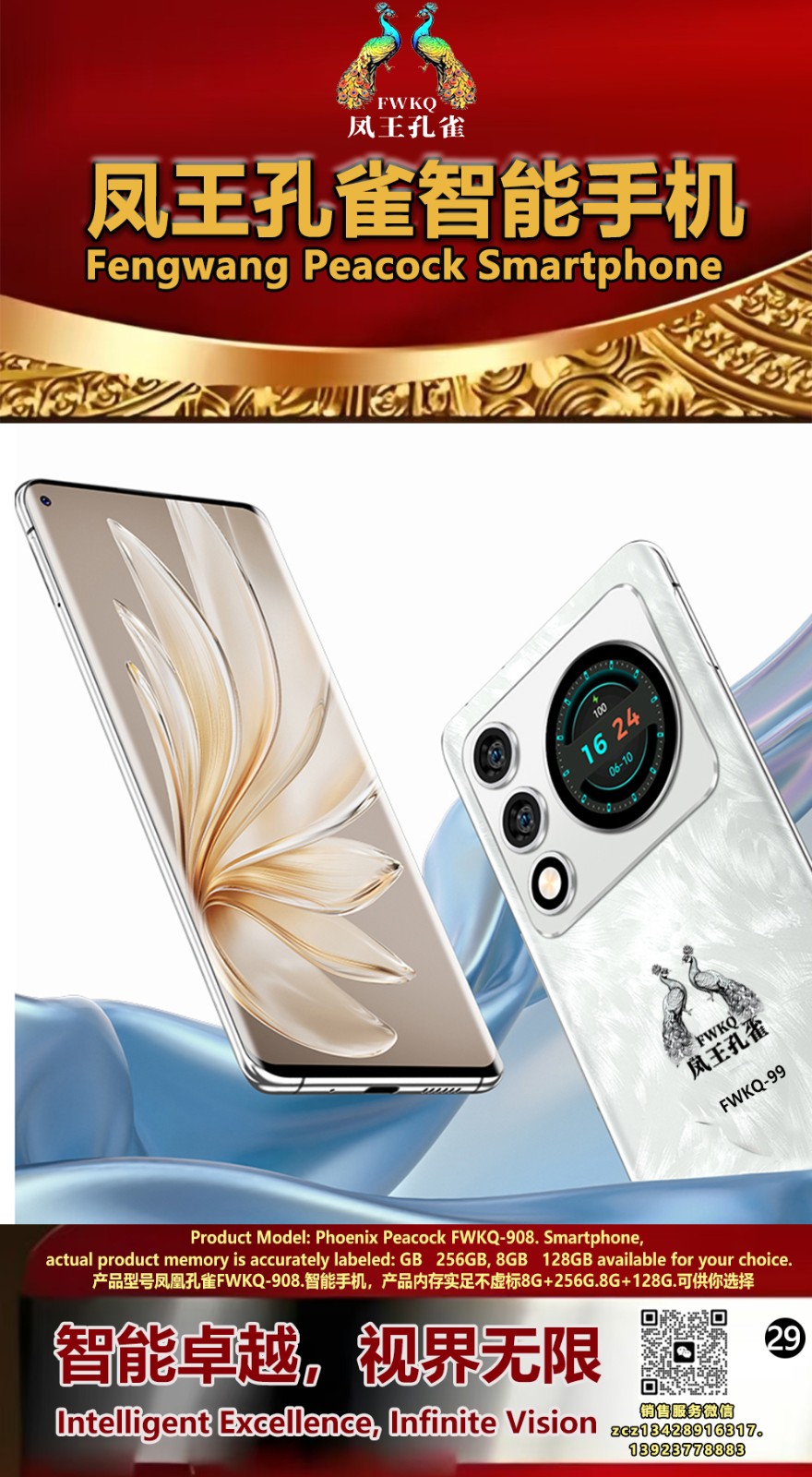 FWKQ凤王孔雀智能手机6.55英寸 -产品编号:L66, FWKQ-99 实足8G+128G售价1180元。8G+256G 售价.1680 像素5000万 深圳包邮 产品链接 视频链接