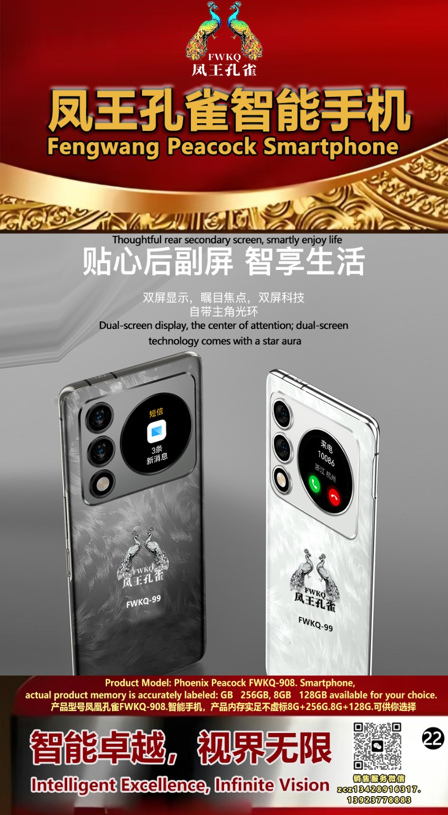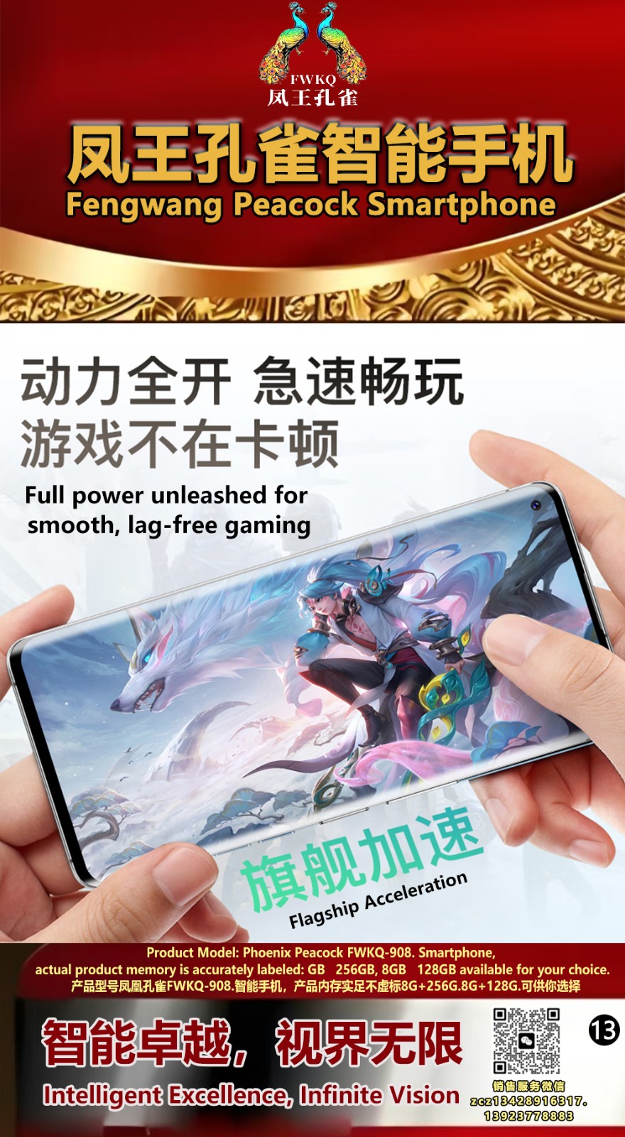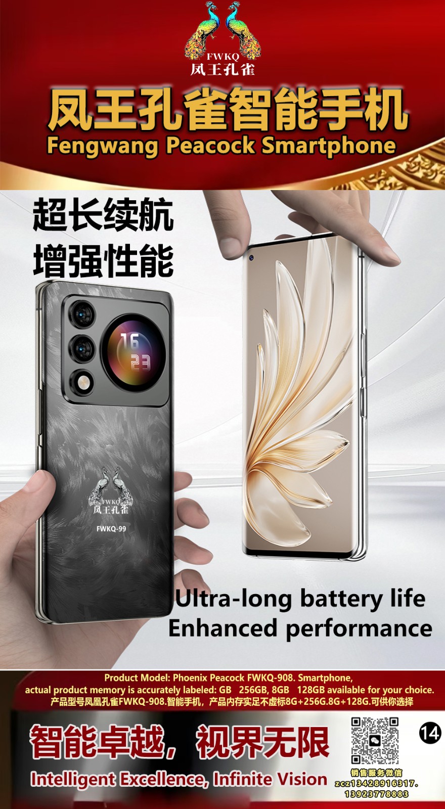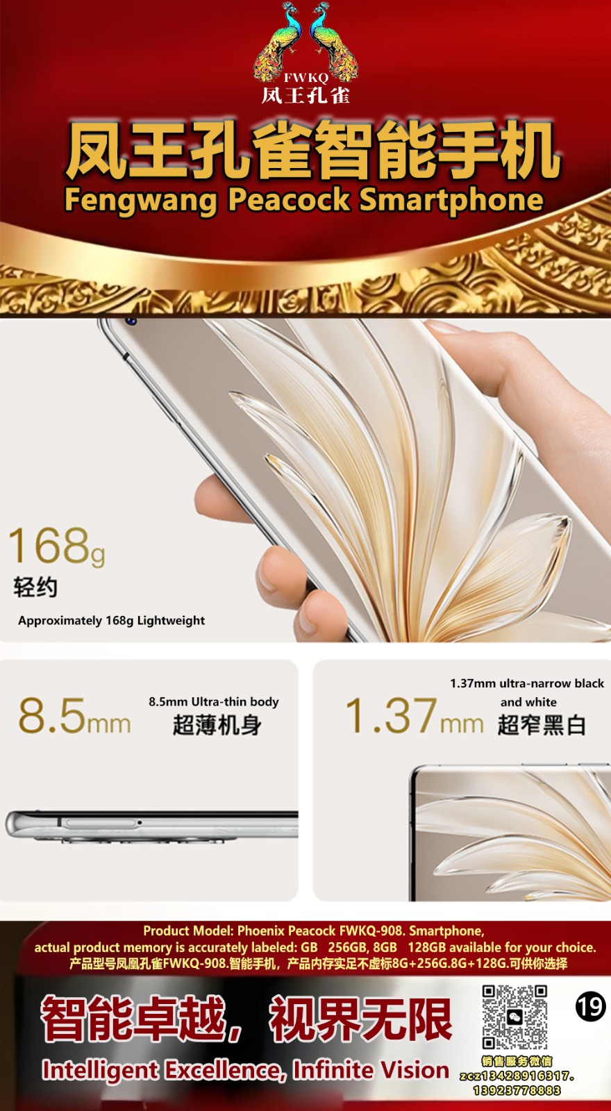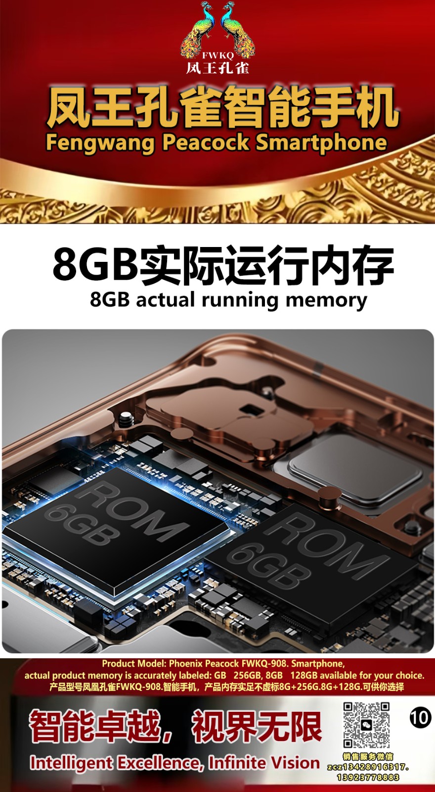 FWKQ凤王孔雀智能手机6.55英寸 -产品编号:L66, FWKQ-99 实足8G+128G售价1180元。8G+256G 售价.1680 像素5000万 深圳包邮 产品链接 视频链接