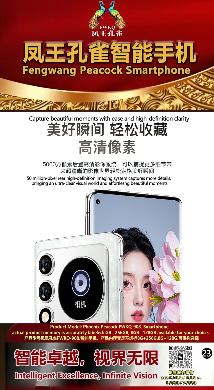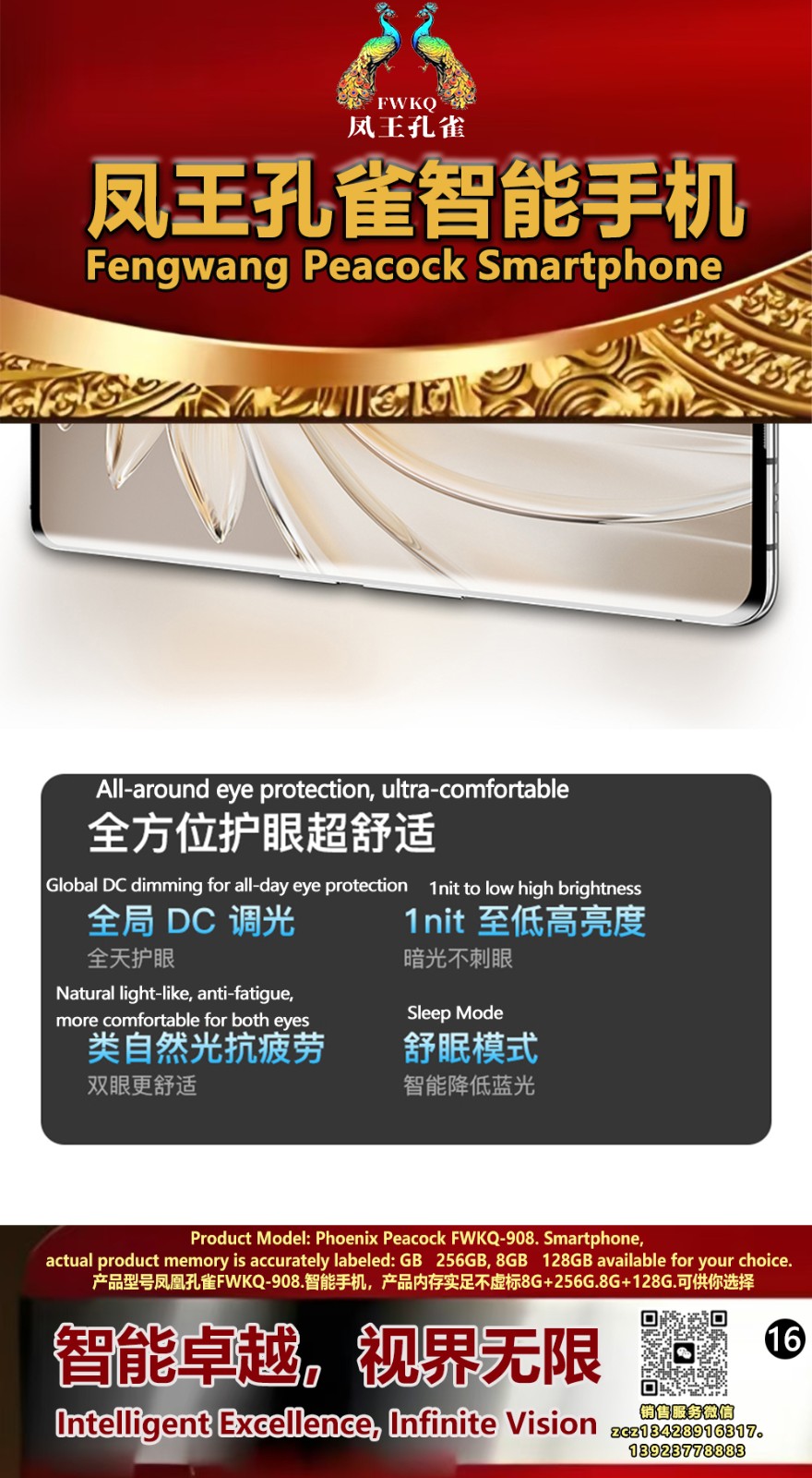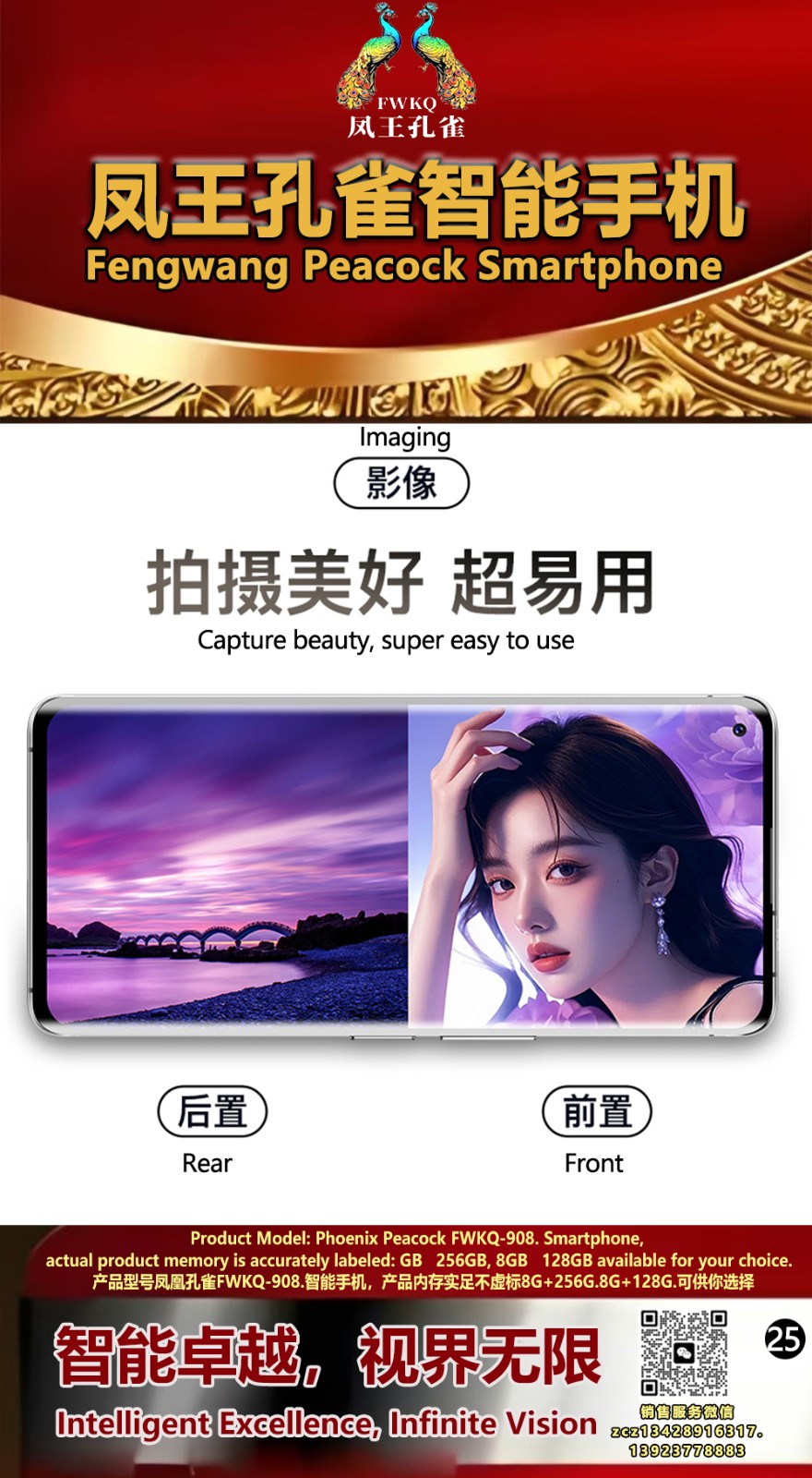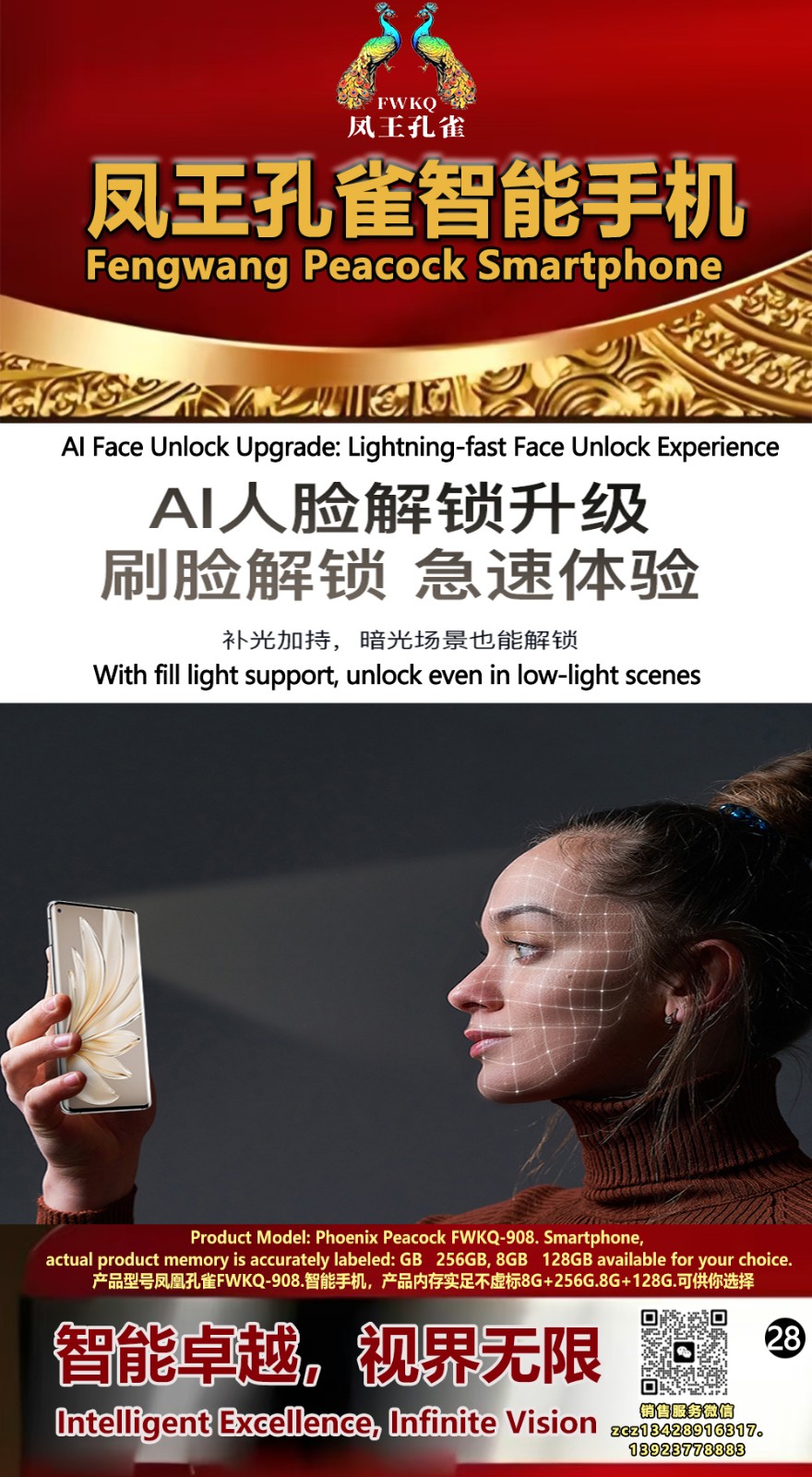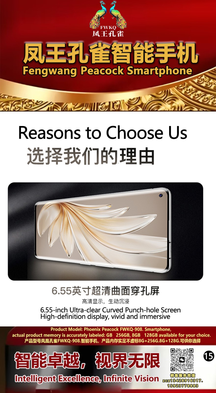 FWKQ凤王孔雀智能手机6.55英寸 -产品编号:L66, FWKQ-99 实足8G+128G售价1180元。8G+256G 售价.1680 像素5000万 深圳包邮 产品链接 视频链接