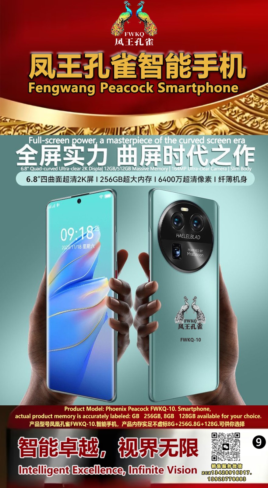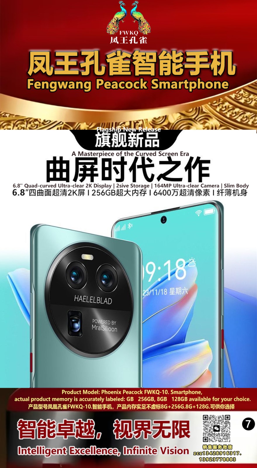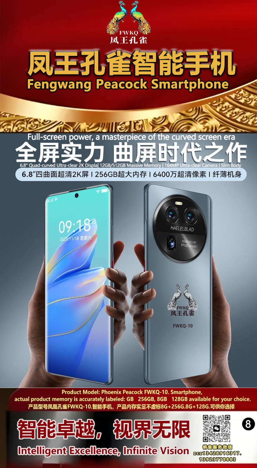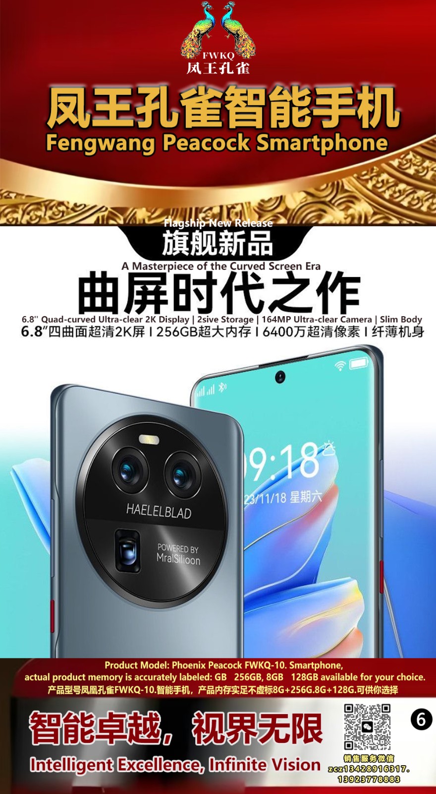 FWKQ凤王孔雀智能手机 产品编号:L10, 6.8”OLED双曲屏8+256G全网通,6400W高清像素,售价.1680 深圳包邮 产品链接 视频链接