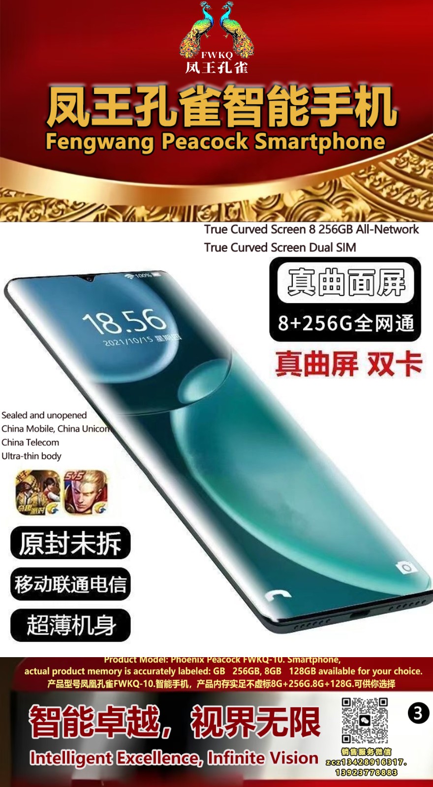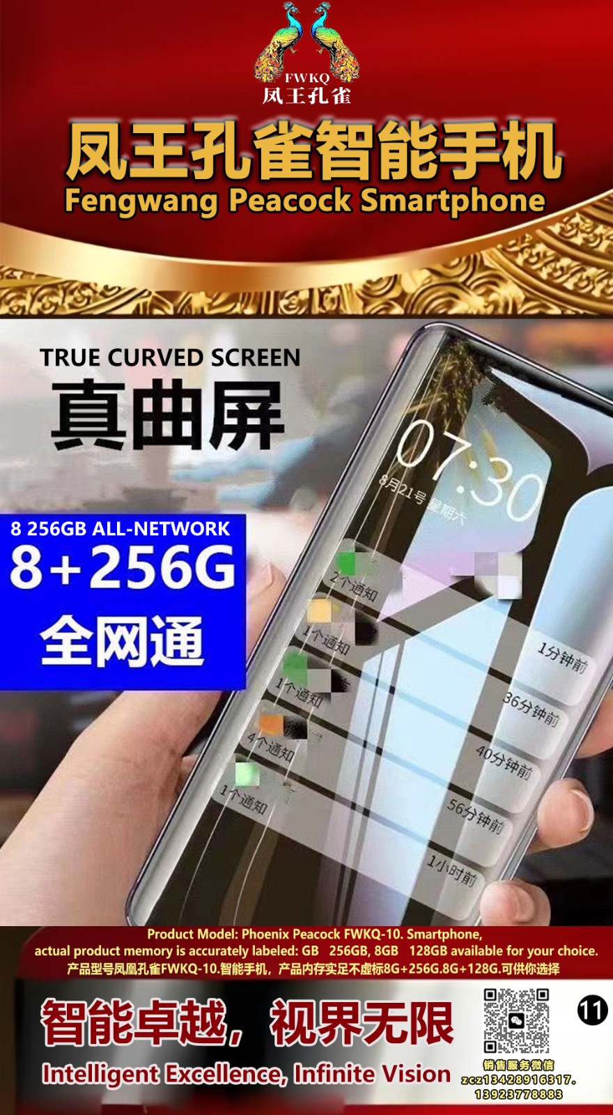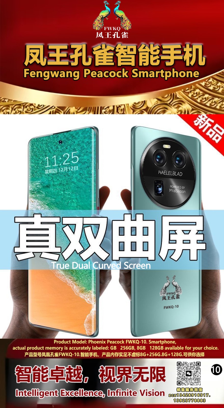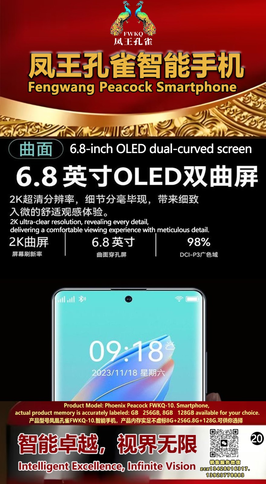 FWKQ凤王孔雀智能手机 产品编号:L10, 6.8”OLED双曲屏8+256G全网通,6400W高清像素,售价.1680 深圳包邮 产品链接 视频链接