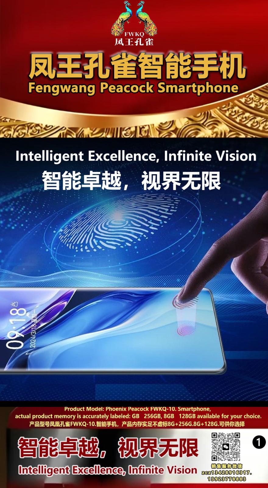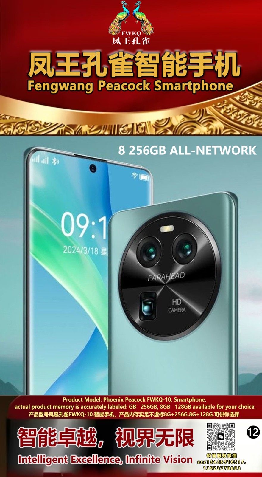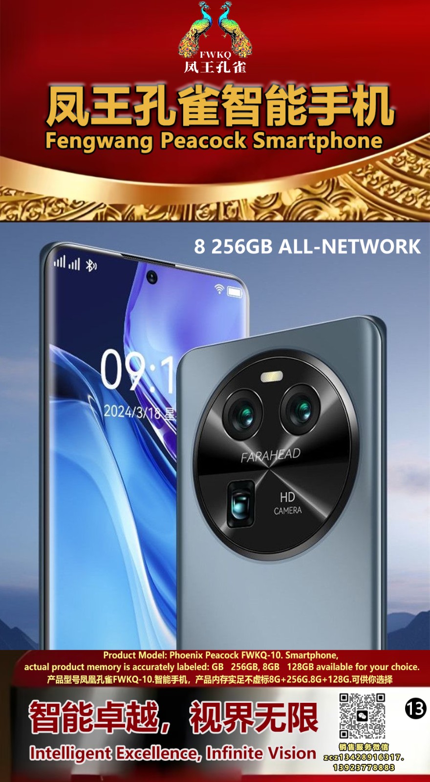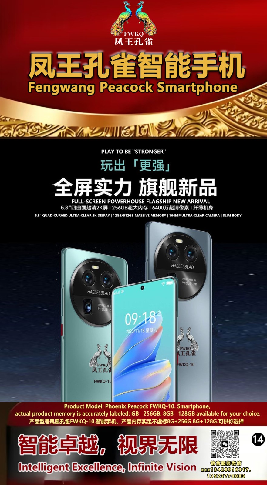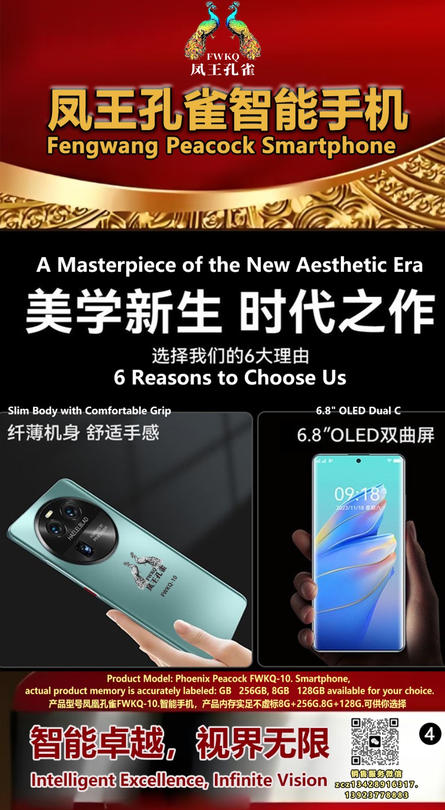 FWKQ凤王孔雀智能手机 产品编号:L10, 6.8”OLED双曲屏8+256G全网通,6400W高清像素,售价.1680 深圳包邮 产品链接 视频链接